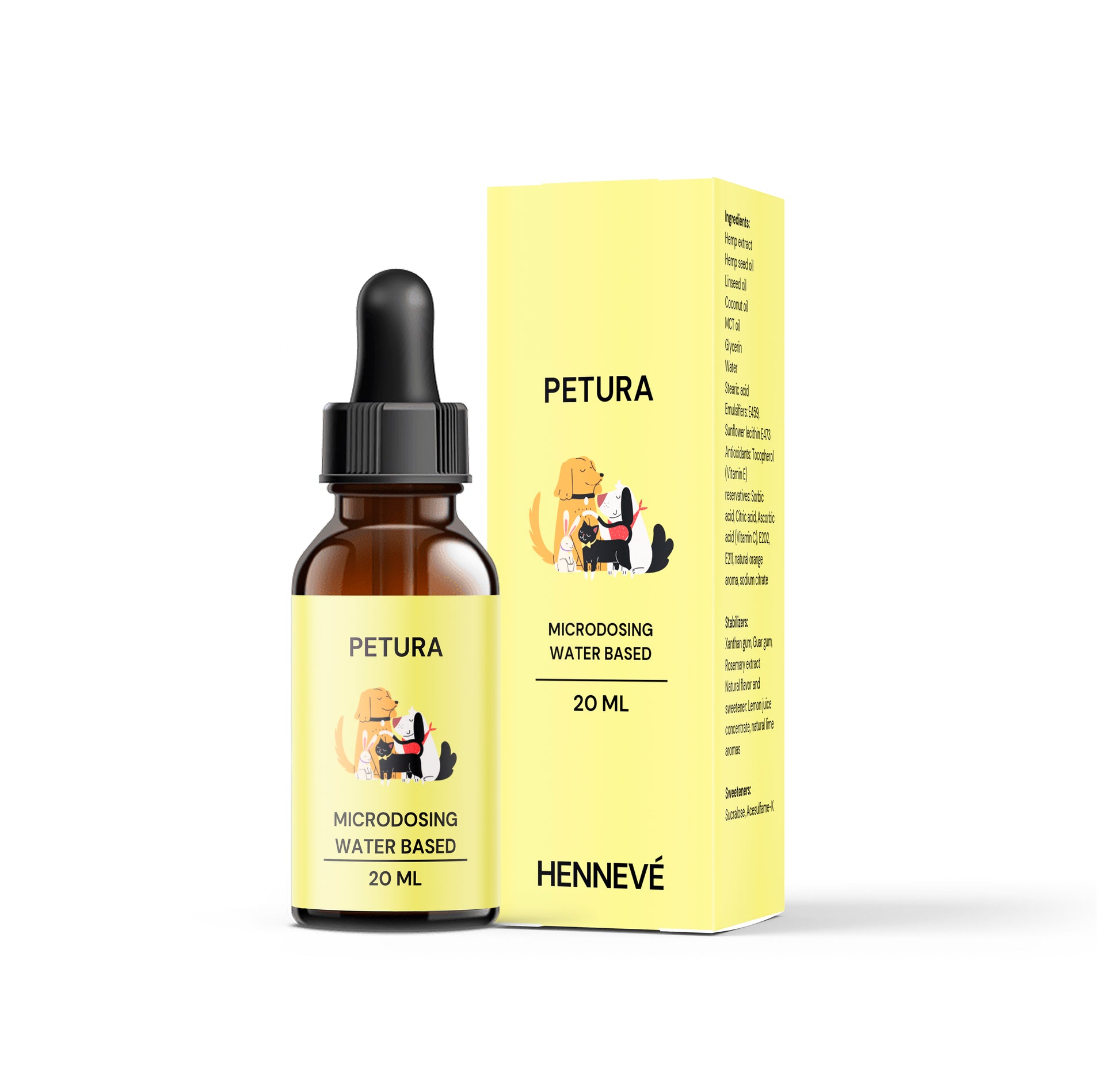 Hennéve is een premium supplement op waterbasis, gemaakt van hennepextract, met een uitgebalanceerd spectrum aan natuurlijke cannabinoïden, waaronder CBD, CBG, CBN en CBC. De innovatieve, in water oplosbare formule zorgt voor een snellere en effectievere opname door het lichaam van uw huisdier.